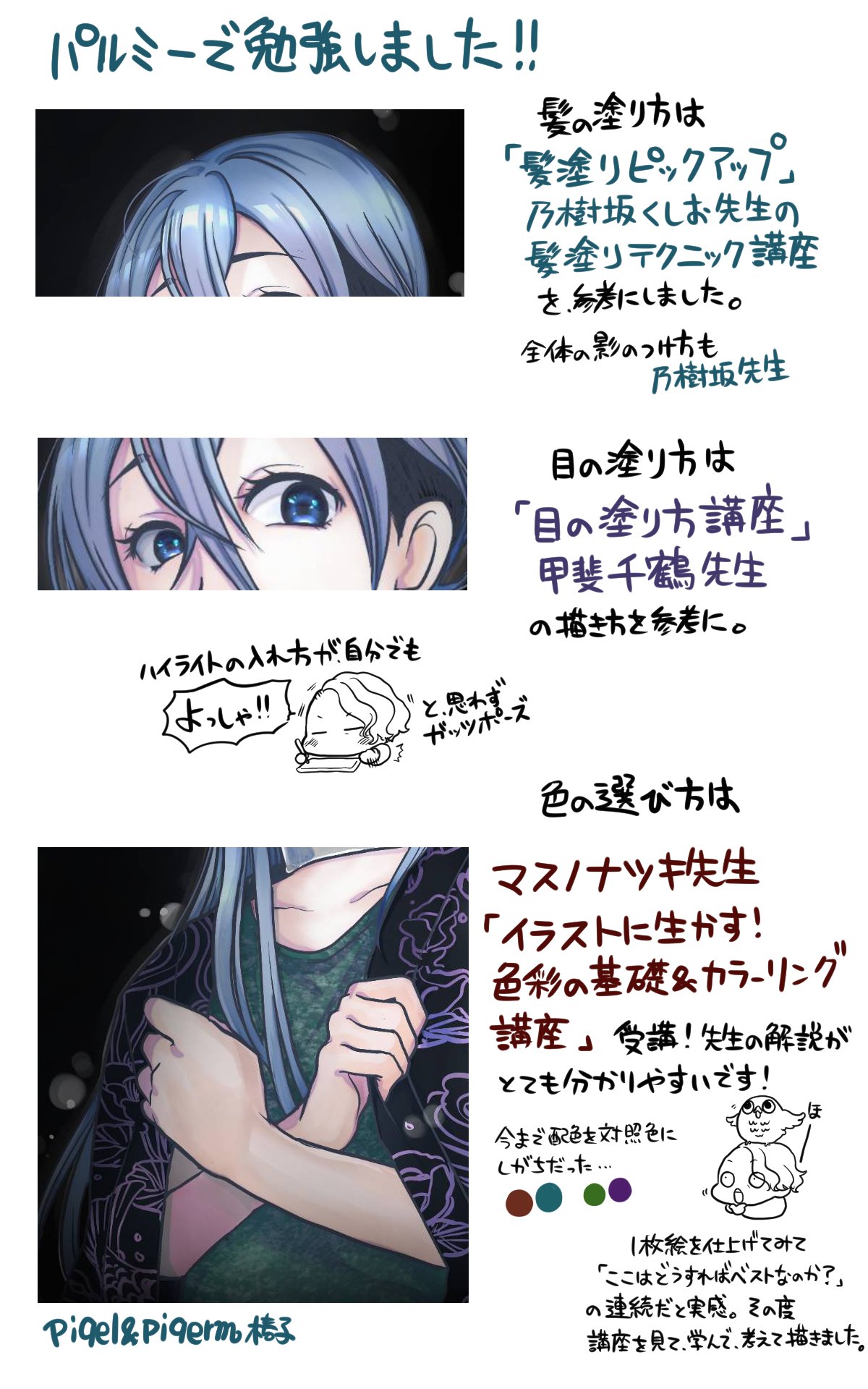 Piqel Piqerm ピケルピケルム パルミーの乃樹坂くしお先生 甲斐千鶴先生 マスノナツキ先生のそれぞれの講座を受講して カラーイラストを描いてみました 今までの描き方だけじゃ気付かなかった発見がいっぱいで 改めて勉強して良かったー と感動して